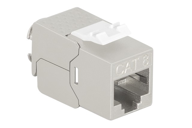 CAT.8 Class I, 2000 MHz, bis 25/40 GbE, GHMT certified • Suitable for Cat.6A, Cat.7A and Cat.8.1 cabling • Shielded zinc die-cast housing, slim type • Suitable for PoE, PoE+ and PoE++ • For AWG 22 up to AWG 26 cable • For cable diameter range 5.0 to 8.5 mm • Suitable for installation in data outlets and panels • Easy assembly without special tools