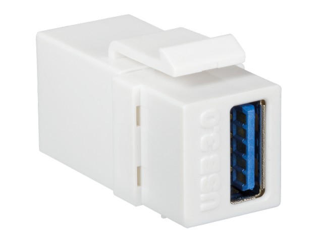 Snap-in Keystone Module suitable for standard keystone panels and outlets • Connections: USB-A female to USB-A female • Application: USB 3.0 cabling • Material: Nickel-plated contact, thermoplastic housing • Dimension: 35 x 14,5 x 16,7 mm • Color: White