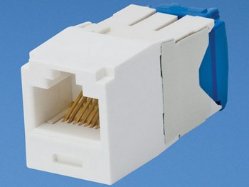 Contacts plated with 50 microinches of gold for superior performance • No punchdown tool required; termination tool (EGJT) ensures conductors are fully terminated by utilizing a smooth forward motion without impact on critical internal components for maximum reliability • Optional termination tool (TGJT) reduces termination time by 25%, ideal for high volume installations • Can be re-terminated a minimum of twenty times • Blue termination cap designates Category 6A performance and provides positive strain relief; helps control cable bend radius and securely retains wires • Terminate 4-pair, 22 – 26 AWG, 100 ohm, solid or stranded twisted pair cable • Universal termination cap is color-coded for T568A and T568B wiring schemes • Accept 6 and 8-position modular plugs without damage • Can be clearly identified with optional labels and icons • Compatible with Mini-Com® Modular Patch Panels, Faceplates, and Surface Mount Boxes