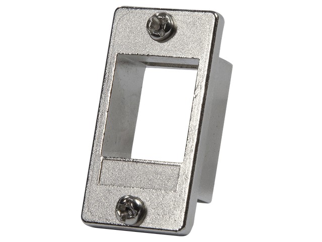 Mounting bracket for keystone modules max. 19.2 x 14.9 mm • Easy snap-in mounting of keystone module • Two holes for screw mounting, 29,01 mm apart • Housing cutout (WxH): 16.8 x 22.8 mm • Material: Die-cast zinc, nickel plated • Dimension: 33.5 x 19.12 x 9.8 mm