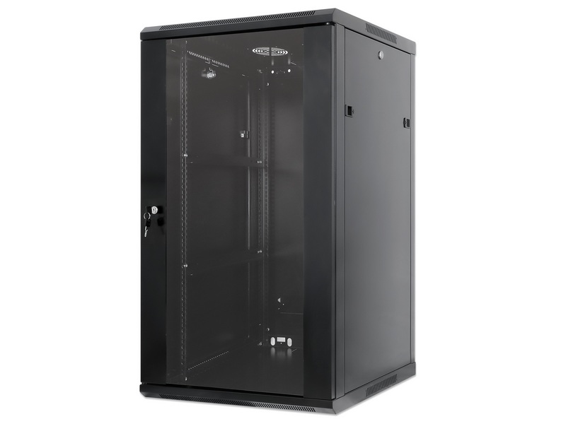 Ideal for 19" rackmount applications • Maximum static load of 60 kg • Usable depth: 500 mm • Tempered-glass door can be opened more than 180° • Cable entry via rear or top panel • Cold-rolled, galvanized SPCC steel with up to 1.2 mm thickness • Reversible Front door • Lockable removable side panels • Ships assembled with 4 mounting rails, installation hardware including tool, 20x M6 Sets and 6x Keys