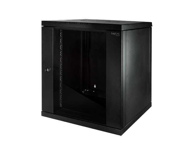 High-quality pre-assembled wall cabinet (can be dismantled) • Robust powder-coated frame made of 1.2 mm steel • Glass door with cylinder lock • Removable side panels • Cut-outs for cable entry and ventilation • Depth-adjustable mounting rails • Maximum static load up to 70 kg • UL and GOST-R certified • Color: RAL 9005 black