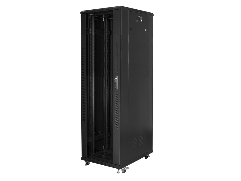 Made of high quality steel • Designed for self-assembly (FLAT PACK) • Cable feedthroughs from top and bottom (adjustable) • Equipped with numbered mounting rails • Includes feet, casters with brakes, ventilation panel, grounding kit, two vertical cable organizers • Maximum static load: 800 kg