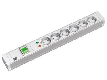 Solid body PVC compound, glow wire resitant 850°C Colour: Pantone 425U • 6 Socket outlets 250V / 16A, Polyamide PA6 GF30, glasfiber, 850°C glow wire resistant, Colour Pantone cool grey 2U, 35° turned outlets, nickel plated earth contacts • plastic parts and end caps PA6 GF30, glasfiber, 850° glow wire resistant, Colour, Pantone cool grey 2U • Switch, illuminated, 2 pole, 16A • Overvoltage protection • Optical mal-function indication • Rated Power: 16A, 3600W • 2 metal fixings included