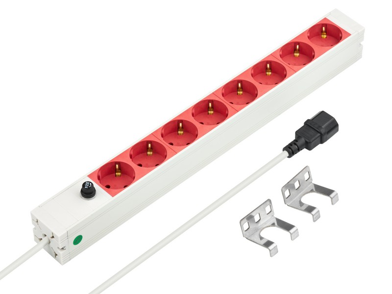 19" 1U socket strip in aluminium profile • Outlets 8 x CEE 7/3 • With overload protection 10 A • With increased personal protection against electric shock • Cable 2.0 m H03VV-F 3G 1.0 mm2 with plug IEC C14 • Colour outlets red, housing aluminium • Certifications CE, RoHS