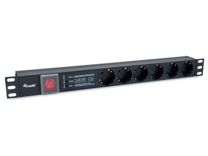 Strujna priključnica, 19", 6xSchuko, prekidač, prenap. zaštita+flter, ALU, crna, kabel 1,8m , equip, 333317