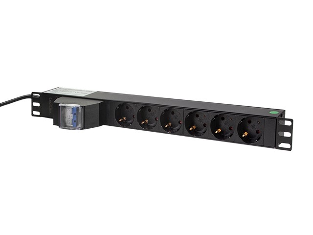 Power strip for mounting on 19" profile frame (1U) • Robust aluminum housing, IP20 • Sockets: 6x safety socket CEE 7/3 • Connection: German plug CEE 7/7, angled • Voltage/Power: AC 230 V, 50 Hz, 16 A, max. 3600 W • With 2 pole circuit breaker • 2 m connection cable H05VVF 3x1.52 • Color: Black