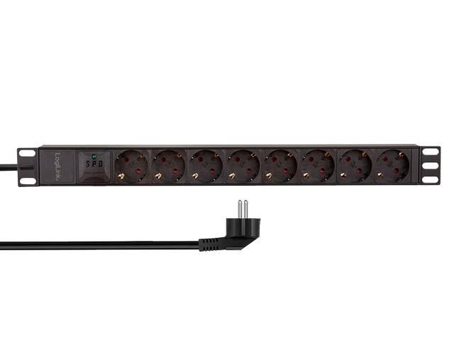 Power strip for mounting on 19" profile frame (1 U) • Robust aluminum housing, IP20 • Sockets: 8x safety socket CEE 7/3, 45° angled • Connection: German plug CEE 7/7, angled • Tech data: AC 230 V /16 A, 50 Hz, max. 3600 W • With surge protection • 2 m connection cable H05VVF 3x1.52 • Color: Black