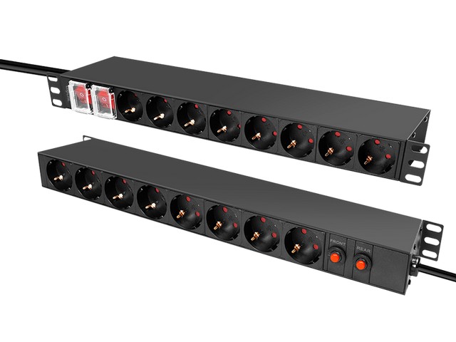 Power strip for mounting on 19" profile frame (1U) • Sockets: 16x safety socket CEE 7/3 • 8 sockets each on front and back with on/off switch • Connection: German plug CEE 7/7, angled • Tech data: AC 230 V /16 A, 50 Hz, max. 3600 W • With overload protection, 16 A/250 V • 2 m connection cable H05VVF 3x 1.5 mm2 • Rugged 1U aluminum chassis, black