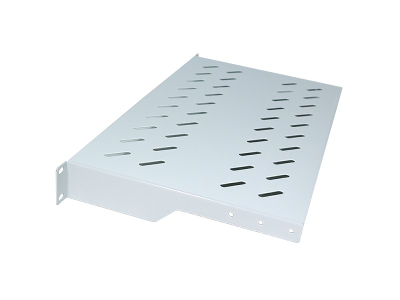 Cantilever shelf for mounting on front 19" profile • Footprint: 440 x 300 mm, Installation: 1 height unit • 1.1 mm steel plate with ventilation slots • Maximum static load: 15 kg • Color: RAL 7035 light grey • M6 mounting kit included