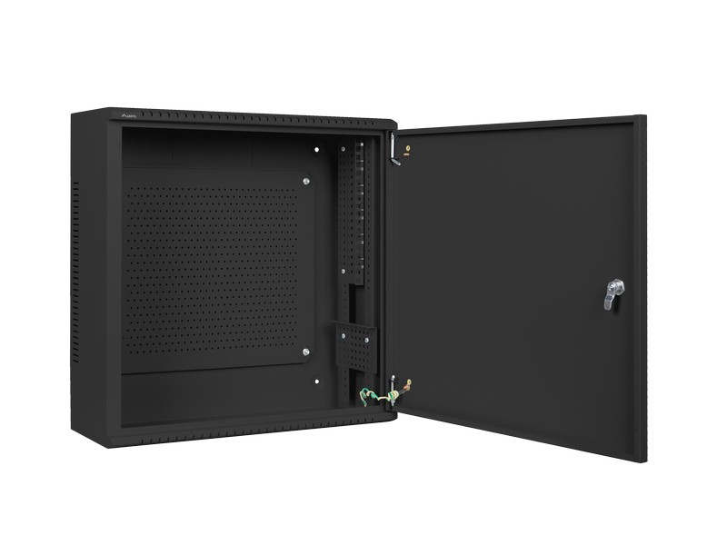 Two mounting rails, vertical 4U and horizontal 3U • Mesh plate located on the rear wall (using an M6 screw to attach components to it) • Cable holes in the top and bottom panels unscrewed • Knock-out holes in the rear wall of the cabinet • Double-sided opening doors • Ventilation holes in the upper and lower panels and side walls • Included Accessories: Front lock, M6 screws, DIN rail TS-35, Grounding cable, User Manual