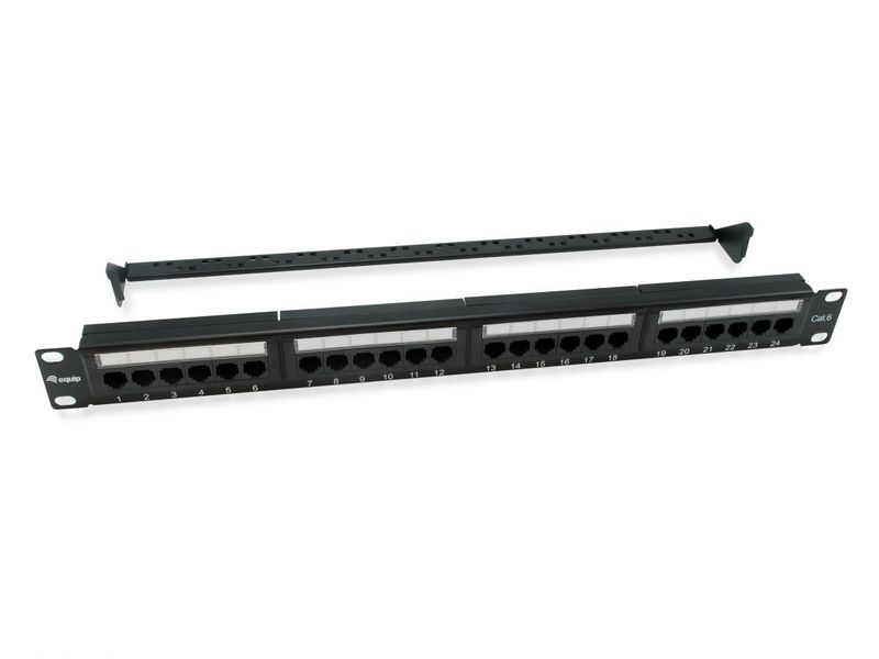 UTP prespojni panel Cat.6, 24-Port, 19" 1U, sa stražnjim držačem kabela, crni (RAL 9005)