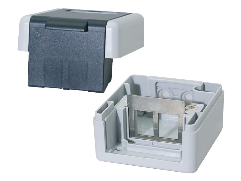 Outdoor box for 1 or 2 Keystone modules • Shatterproof, weather-resistant housing • Protection class IP44 (closed, without patch cable) • For temperature range from -20° to +70°C • Cable entry from above, exit to the bottom • Practical hinged lid with labeling field • Suitable for cable diameters from 7 to 9.5 mm • Color: Grey housing, anthracite flip cover • Delivery without keystone modules
