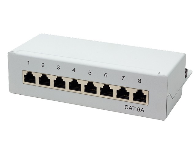 Cat.6A 10G Class EA 500 MHz • ISO/IEC 11801 and TIA/EIA 568C.2 • 8 shielded RJ45 jacks • Steel housing, RAL7035 light grey • Supports PoE, PoE+ and PoE++