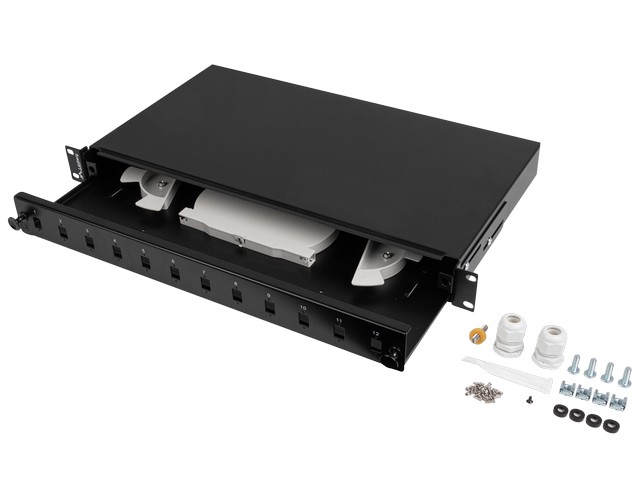 Opt. patch panel 19" 1U za 12xLC-D, kpl. s 2 kab. uvodnice i splice kazetom za 24 niti, izvlačivi, crni (RAL 9005)