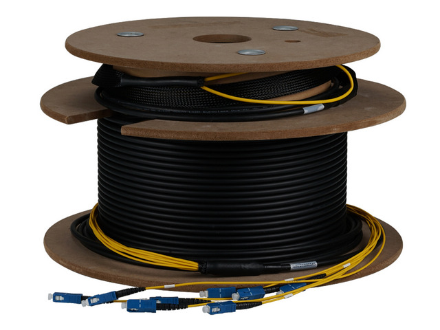 4, 8 or 12 fibers per cable • Fibre class OS2, OM3 or OM4 • Factory production, polishing and function test • Double-sided assembled stepped cable whips (longest length 1 m) • Identification of the remote individual cables with cable markers (numbers) • Serial number on the cable • Attenuation protocol for each individual fiber is provided • Delivery on both sides with fabric hose as drawing-in tube • Delivery up to 40 m in polybag, from 50 m on disposable drum • Raw cable: CPR-Class Dca • Length of the draw-in tube of 130 cm, diameter: 4 fiber approx. 10 mm, 8 fiber approx. 15 mm, 12 fiber approx. 20 mm