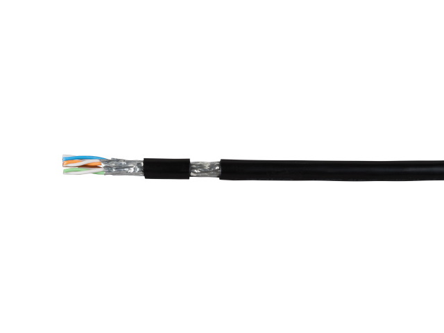 The Cat.7 S/FTP indoor/outdoor cable is characterised by the cable construction 4x2xAWG23/1 and achieves a transmission frequency of up to 1200 MHz • The cable has a PE outer sheath and a halogen-free inner sheath and conforms to the IEC 60332-1 standard and Construction Products Regulation (BauPVO) Euroclass Dca • The cable is suitable for installations in dry or damp rooms, outdoors or underground • Conforms to the standards ISO/IEC 11801, DIN EN 50173, DIN EN 50288-4-1