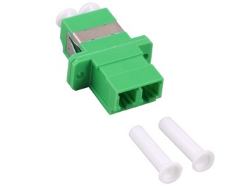 2x LC Duplex female connector, SC-Simplex footprint • One-piece housing with flange • Ceramic sleeves • Housing material: Plastic PC UL 94V0 • For installation in fiber boxes with screw mounting • Housing color: green (OS2 APC) • With dust caps and fixing screws