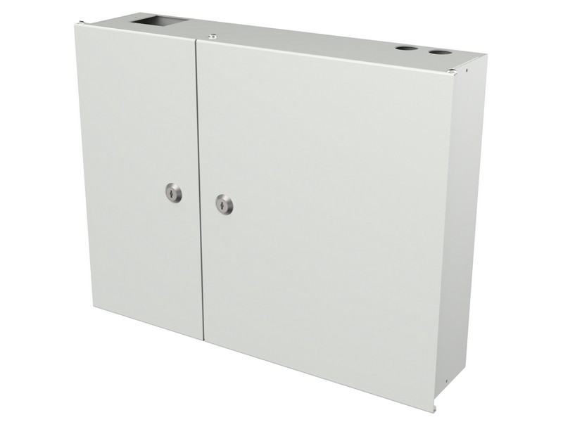 Housing with two swing doors, lockable • 2 different locks with 2 keys each • With 2 cable entry openings at the top and bottom for PG16 plus 2 cable entry openings with sealing strip • Additional strain relief clamps and guides for fiber and cable storage for fastening with cable ties • Max. 5 splice cassettes and one Distributor plate can be mounted • Up to 6 Pro splice cassettes can be mounted • The distribution plate is fastened in two ways M3 screws • Dimensions (W) x (H) x (D) 430 x 330 x 100 mm • Sheet steel 1.2 mm, weight approx. 4.6 kg