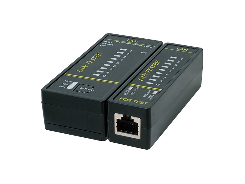 Tests network and telephone patch cables, with PoE finder • Suitable for RJ45, RJ11 and RJ12 patch cables • Master and remote unit with LED status indicators • Tests continuity, assignment, ground and short • Also checks already installed cables with the remote unit • Identifies the existence and type of PoE (Midspan or Endspan) • Includes convenient magnetic holder, battery indicator and light • 9 V battery required (not included)