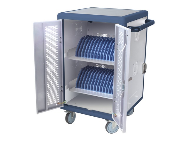 Security locker for notebook, tablets and smartphones with internal shelves with removable plastic dividers • Fully assembled, built in 1,5 mm thick steel structure, powder-coated • Charging trolley with 3 shelves with 10 housings each, for a total of 30 plastic housings with integrated management cable system • It has 6 Multi-socket with 5 Italian-dual-size/german sockets with a total amount 30 Schuko sockets available • Double ventilated front door with two-point key-operated handle and 180° opening angle • Double ventilated rear door with two-point key-operated handle and 180° opening angle • Fixed side panels, one of this is fitted with three 120x120 mm side ventilation fans • Upper shelf suitable for storing documents or notebooks • Equipped with an external main switch with light and a magnetothermic C16A internal switch • Provided with two handy side handles (dim. 44 x 9 cm) • Equipped with 4 pivoting 5" wheels, 2 of which with brakes • Dimensions (WxDxH): 700 x 640 x 1110 mm • Housings dimensions (WxDxH): 40 x 360 x 290 mm • Color: white/blue