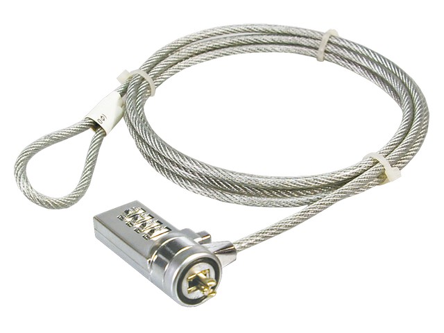 Notebook anti-theft protection • Manufactured acc. industry-standards • Fixation at Notebook standard safety slash • Rugged steel cable, metal lock • Protective PVC Coating • Combination lock with 10.000 combination • Individual combination adjustable • Cable length: ca. 1.50 m