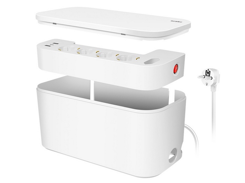 Modern cable box with socket strip and angled CEE 7/7 connector plug • Socket strip: 4x CEE 7/3, 1x CEE 7/16, 2x USB-A, 1x USB-C • Rated power socket strip: 230 V, 50 Hz, 16 A, 3600 W max. • USB output: DC 5 V/3.4 A (17 W max.) • With safety shutter • Two L-shaped outlets for flexible cable routing • Protection class: IP20 • Cable box material: Polycarbonate (PC) • Dimensions: 285 x 145 x 130 mm • Color: White
