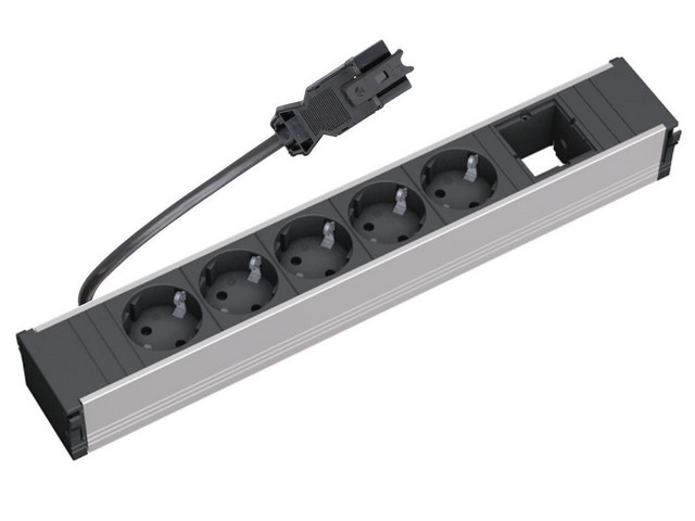 length 6-way, approx. 356 mm • Anodised aluminium profile • power input: 0.1m cable and GST18i3 plug • 5x black socket outlet with earthing contact, set at 35° • 1x custom modules • Power cables and custom modules are available separately