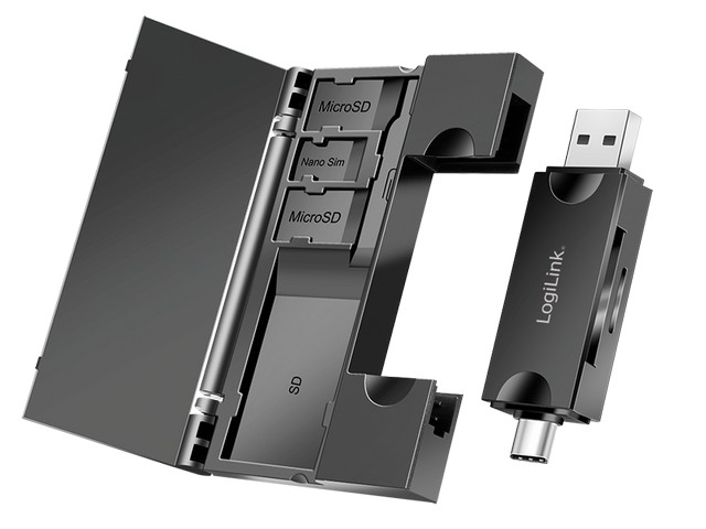 Čitač mem. kartica, USB-A&C 3.2 Gen 1 -> MicroSD/SD, s kutijom za pohranu mem. kartica, crni , LogiLink, CR0049