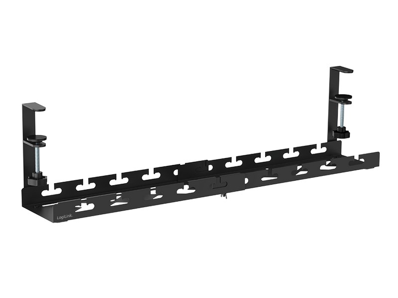 Extendable cable management tray to mount on the edge of a desk (43-73 x 13 x 19 cm) • Free up desk and floor space, resolved under-desk cord clutter • Cable management: Elegantly hides all cables under the desk • Particularly suitable for standing desks • Open architecture for increased ventilation and easier access to wires • Durable construction with multiple cable slots and max. load capacity of 5 Kg • Easy installation with clamp-on system • Including cable management straps to secure the cables • Material: Steel • Color: Black