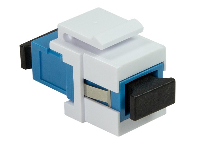 SC simplex inline coupler for keystone panels, blue • For fibre cable with SC connector • Ceramic sleeve, with dust cover • Including frame for mouting in keystone panels, white • Snap-in mounting, without flange